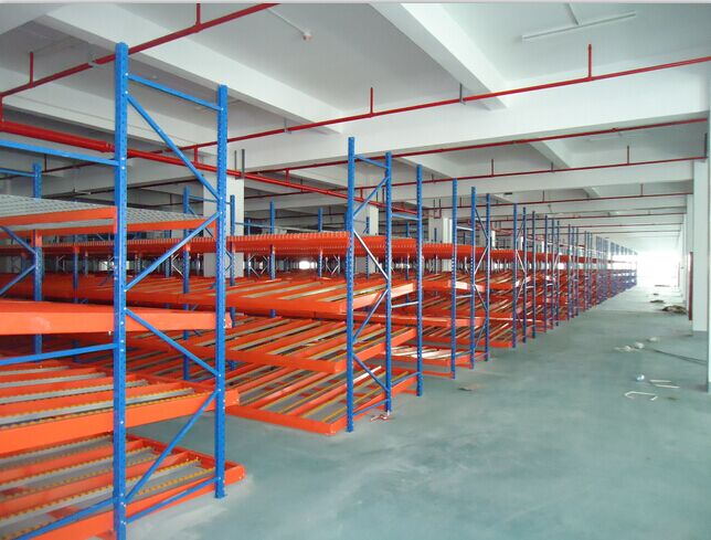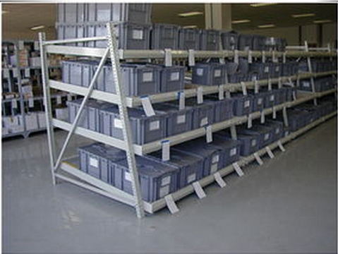 結構特(tè)點 流利式貨架結構特點:流利(lì)式貨架的流利條直接連接到前後橫梁及中間支撐梁上,橫梁(liáng)直接掛在支柱上,流利條安裝傾斜度取決於貨箱的尺寸、重量以(yǐ)及流利架(jià)的深度,通常取5%~9%。流利條滾輪的承載力為6kg/隻,當貨物較重時,可以在一個滾道安裝3-4根流利條。通常在深度方向上每隔0.6m安裝一根支撐梁以增加流利(lì)條的剛度。當滾道較長時,可用(yòng)分隔板將滾道隔開。取(qǔ)貨端需安裝製動片(piàn)使貨物減速,降低衝擊。